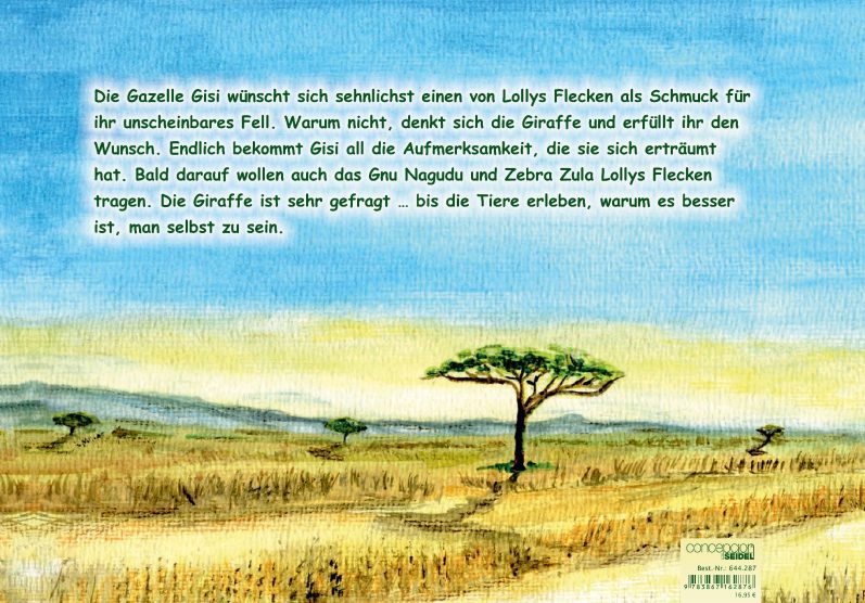 „Warum starrst du mich denn so an?“, fragte die Giraffe Lolly die kleine Gazelle, die neben ihr stand und den kurzen Hals so lang reckte, dass er beinahe abfallen wollte. Lolly hieß eigentlich Lobetia. Ein langer Name für ein langes Tier. Sie lebte in der Savanne Afrikas.